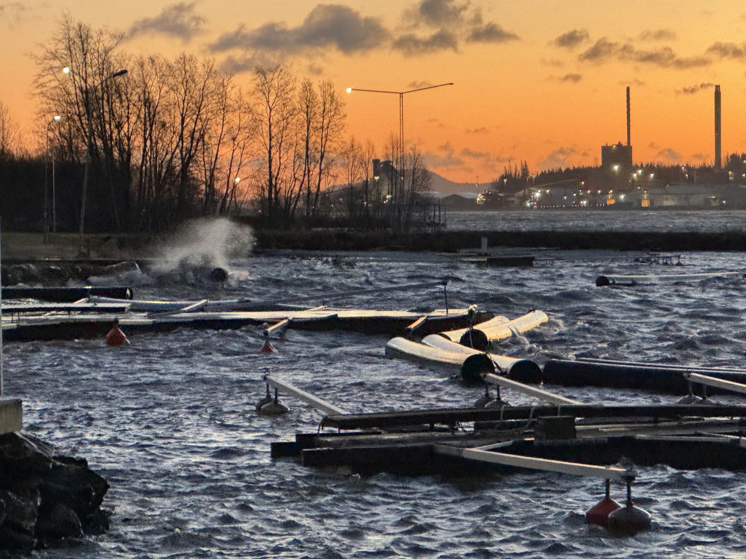Det var iordningställt inför vintern med bryggor och vågbrytare på plats. Innan stormen var över så låg vågbrytarna på land och bryggorna lite huller om buller. Hamnteamet gjorde vad de kunde för att rädda situationen. Det gick väl så där i de enorma krafterna. Nu blir det att se över vad som är skadat och vad som kan repareras eller måste ersättas. Jobb blir det hur som helst!